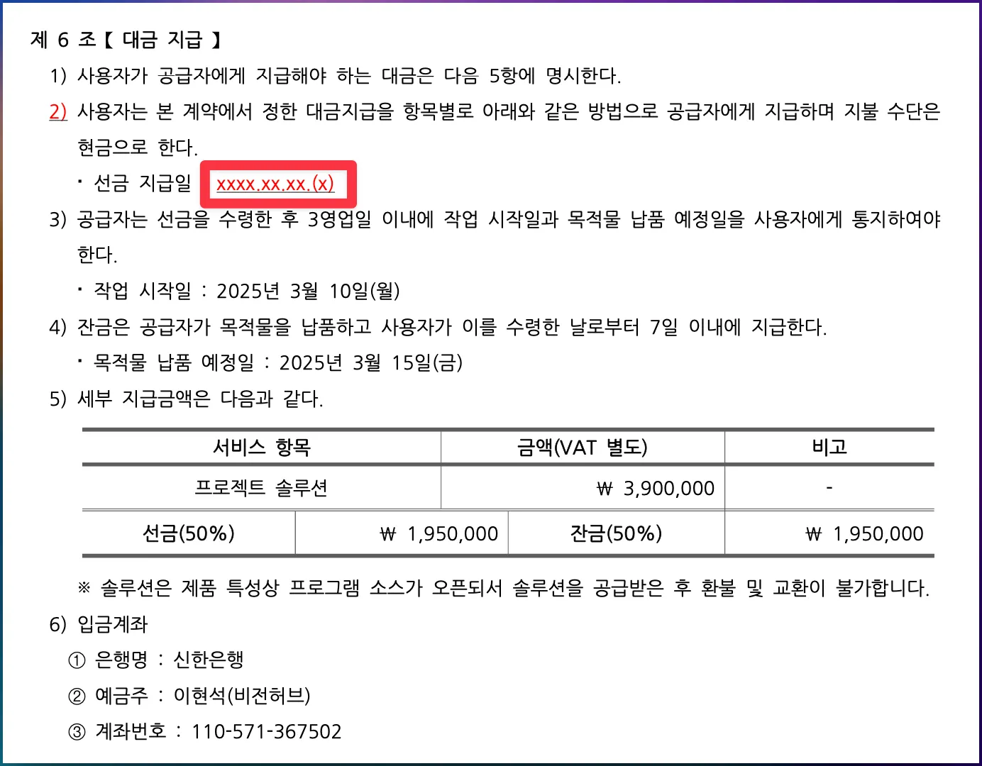 제 6조, 2항에 선급 지금일을 카톡으로 알려주세요.