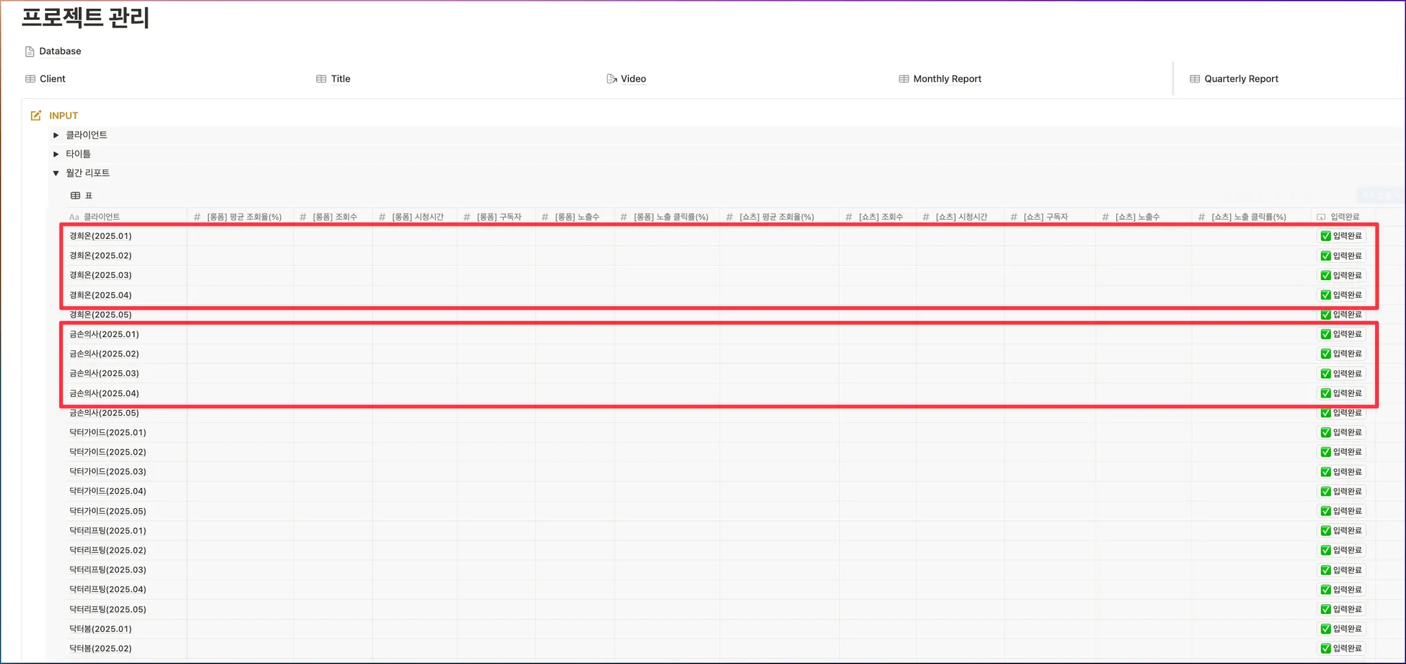 INPUT 섹션 >> 월간 리포트의 월별 해당하는 값을 입력하고 “입력완료”를 클릭하세요.