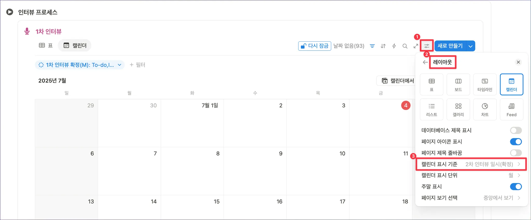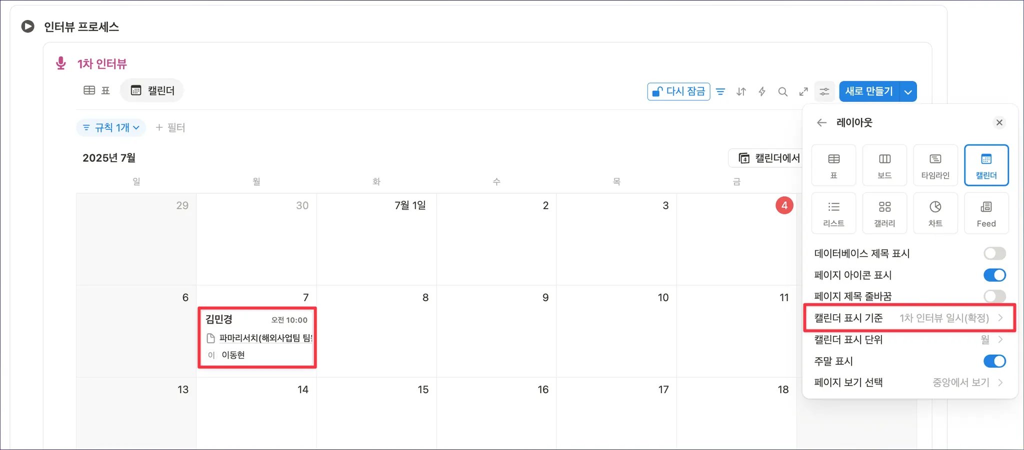 캘린더 표시 기준이 “2차 인터뷰 일시(확정)”이라서 2차 인터뷰 날짜가 보이는 거예요.