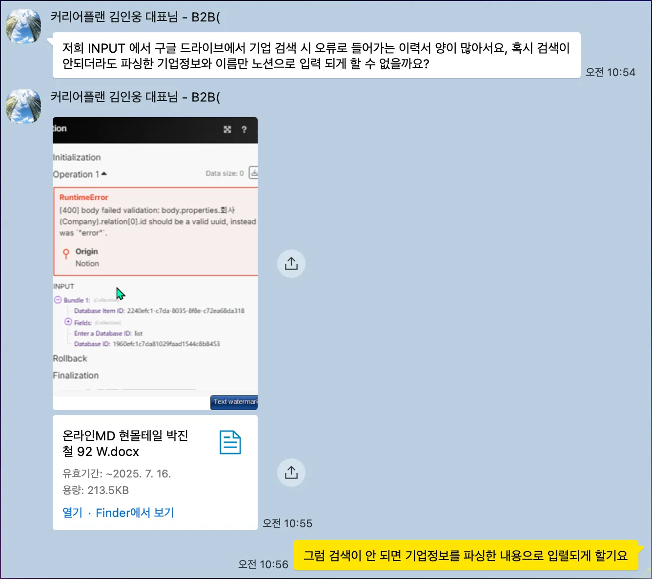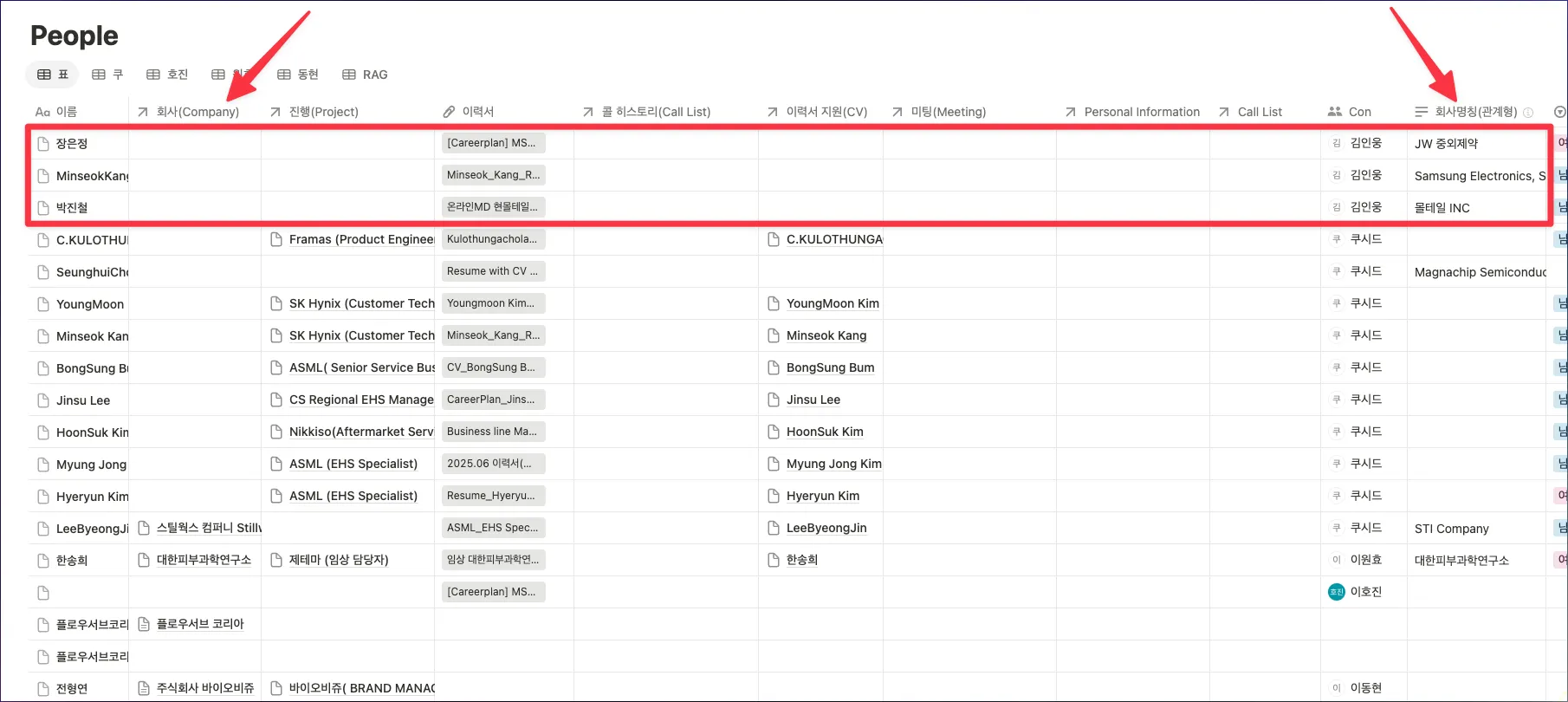대신 이력서는 파싱한 내용을 입력해놨고, 회사명칭(관계형) 필드에 회사 이름을 넣었습니다. 단, Company DB에 데이터가 없어서 관계형은 맺지 못합니다.