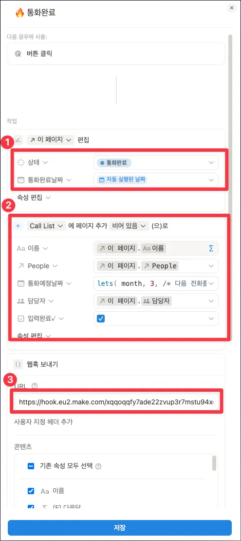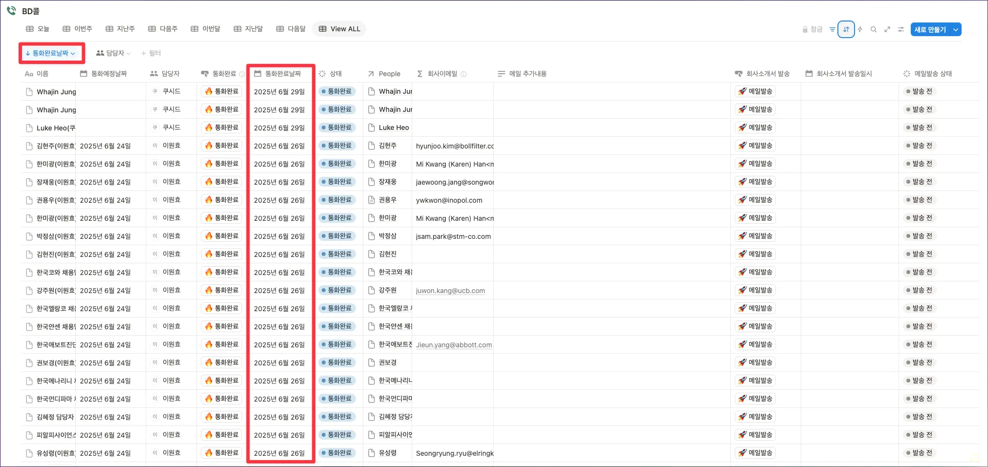 <상태>를 통화완료로 변경하고 <통화완료날짜>에 자동 실행된 날짜를 입력합니다.
