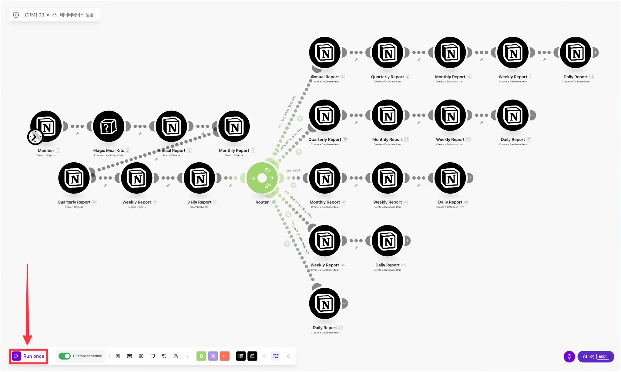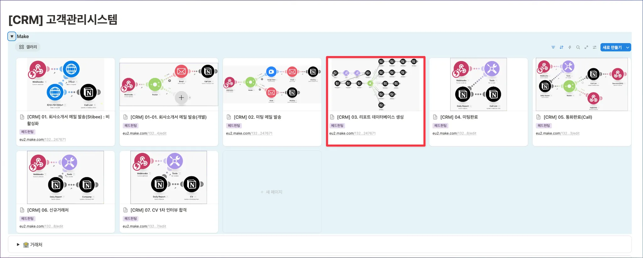 CRM 메이크 시나리오 중 “03. 리포트 데이터베이스 생성” 페이지로 이동합니다.