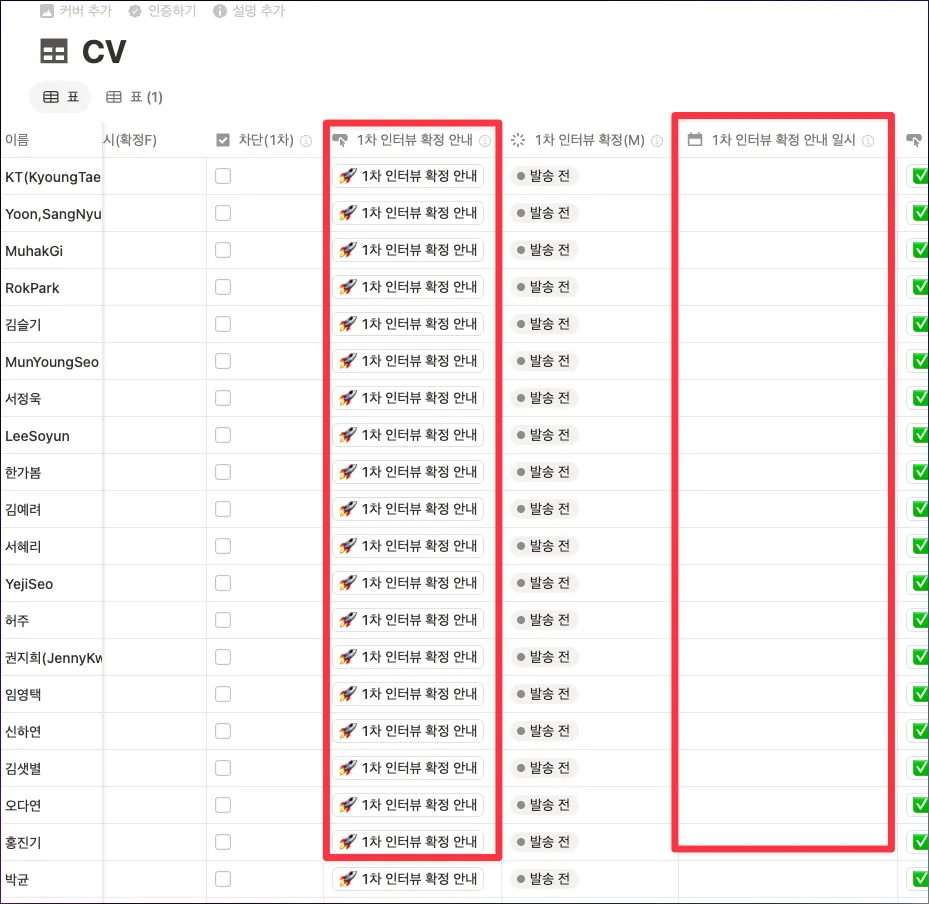 CRM 1차 인터뷰, 2차 인터뷰는 <1차 인터뷰 확정 안내> 버튼을 클릭하면 <1차 인터뷰 확정 안내 일시> 필드에 전송한 일시가 입력됩니다.