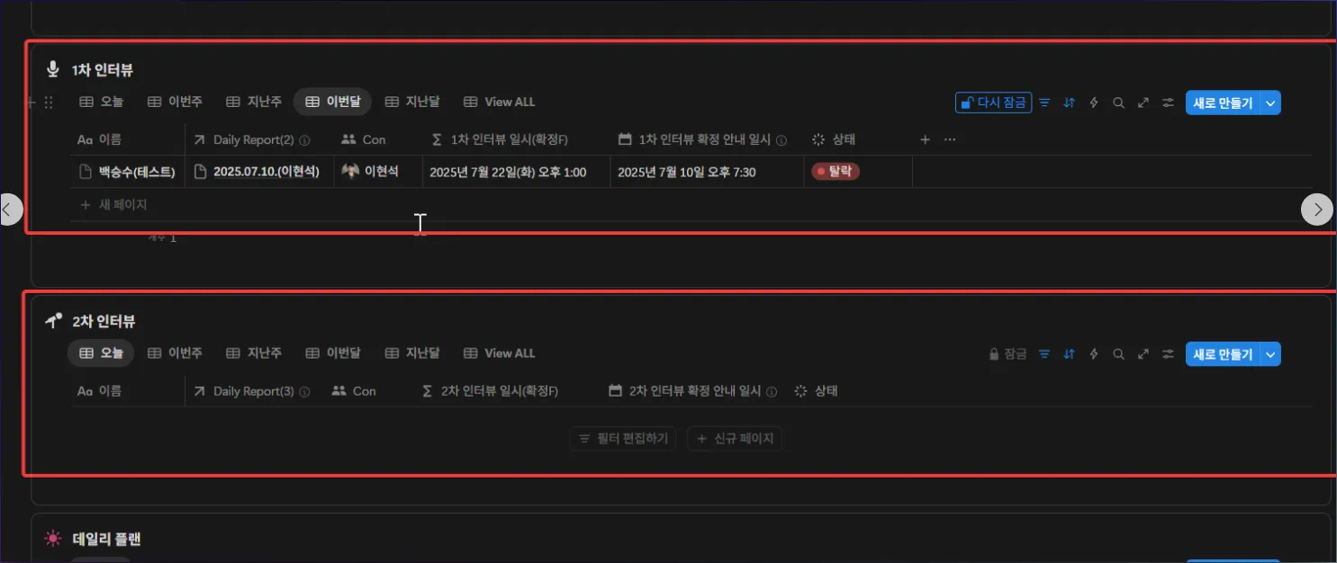 제가 좀 이해가 되지 않는 것은, CRM 1차 인터뷰, 2차 인터뷰 필드가 고객의 인터뷰 일시를 기준으로, 이번달에 면접을 보는 사람이 필터링 되어야 하지 않나요?
