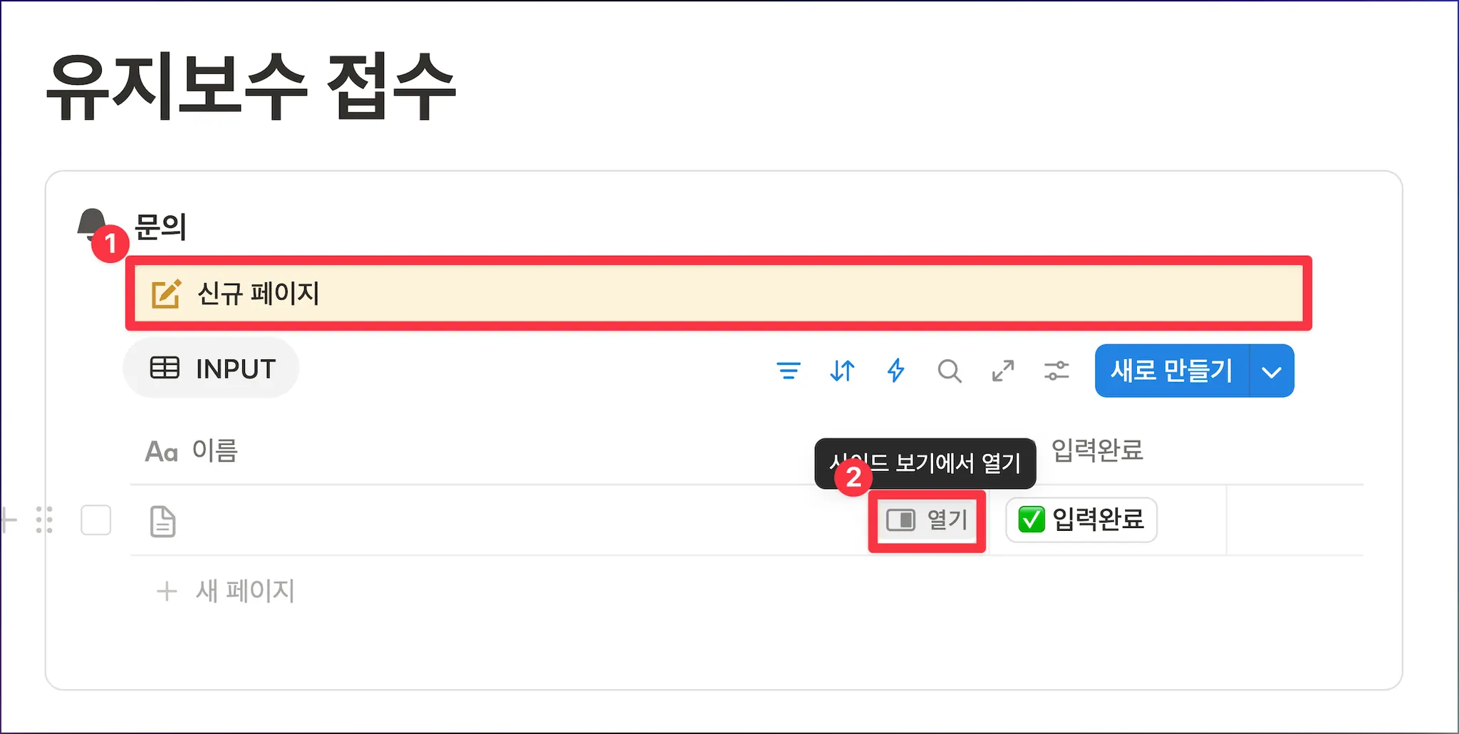아래 블럭을 클릭해서 유지보수 입력 페이지로 이동한다.