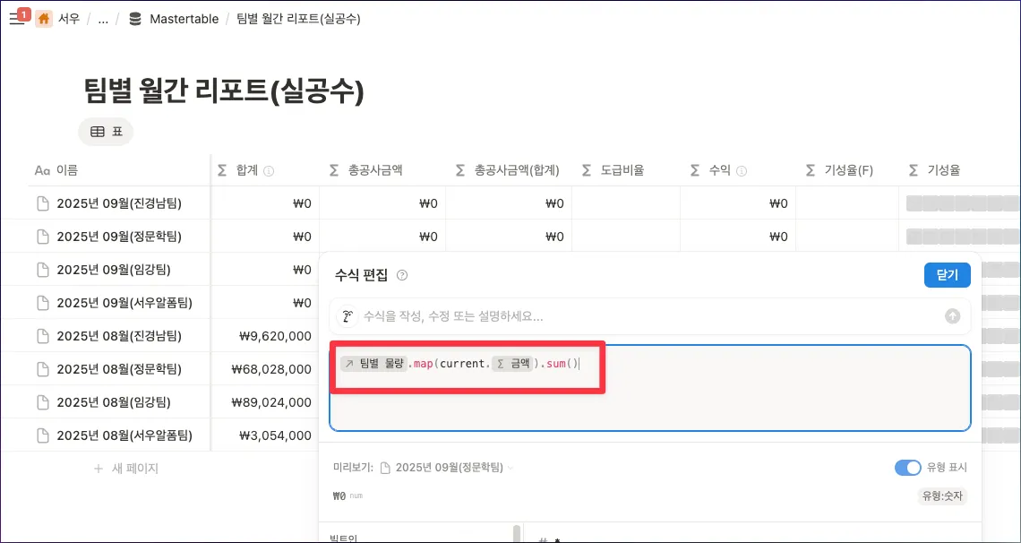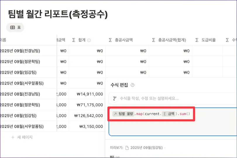 팀별 월간 리포트(실공수), 팀별 월간 리포트(측정공수)의 <총공사금액> 필드 수식 수정했습니다.