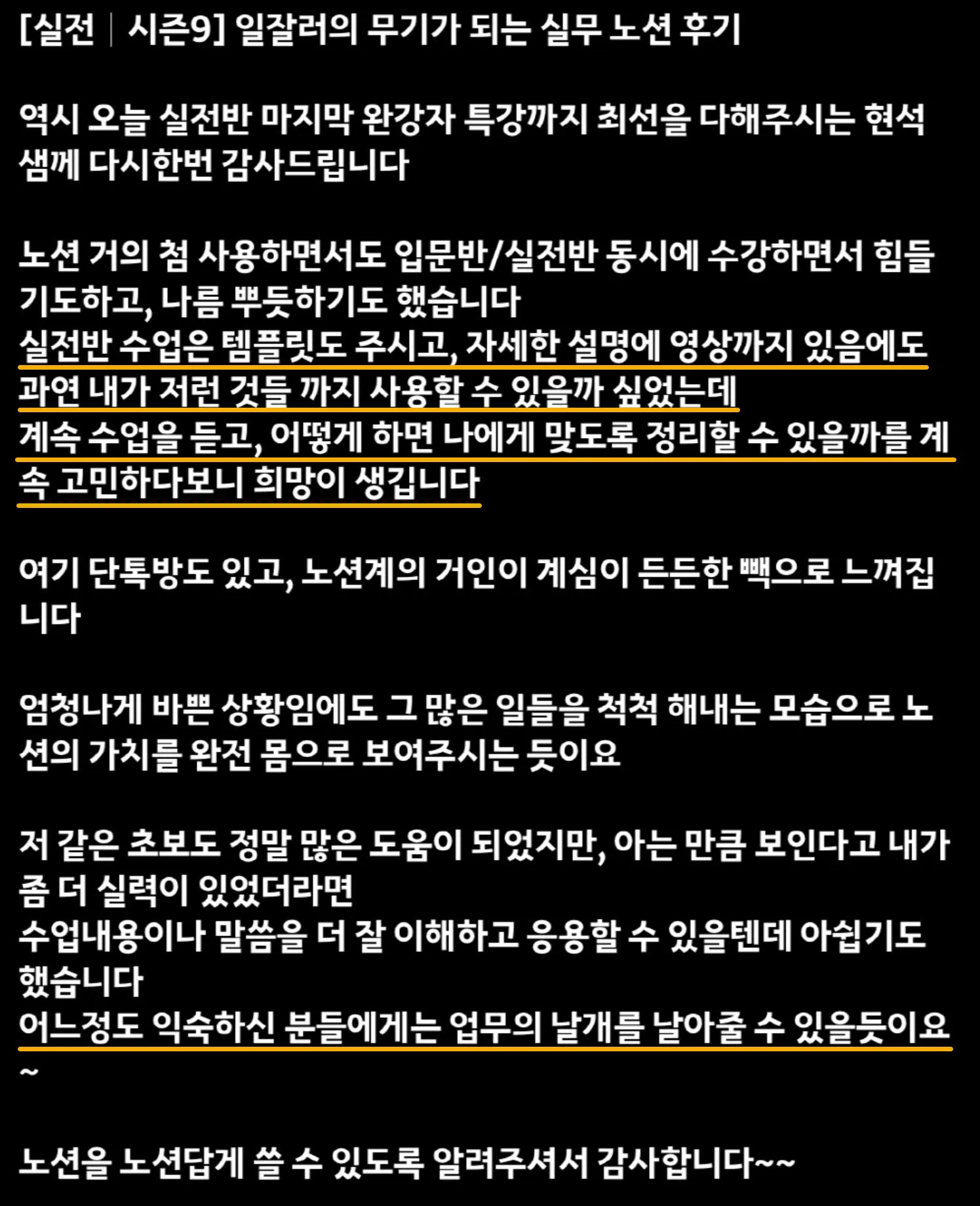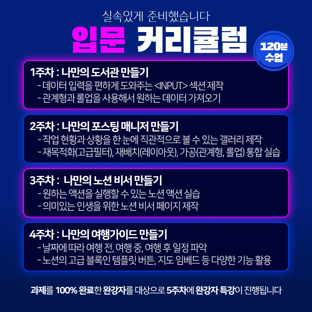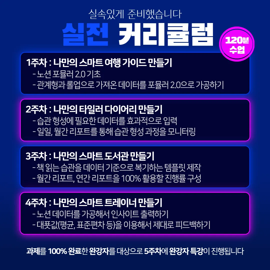 노션에 익숙하거나 엑셀을 어느 정도 다룰 수 있는 분이라면 입문과 실전 과정을 동시에 수강하셔도 됩니다. 강의가 진행되면서 입문과 실전 강의 내용이 연결되는 짜릿한 경험을 하실 수 있습니다.