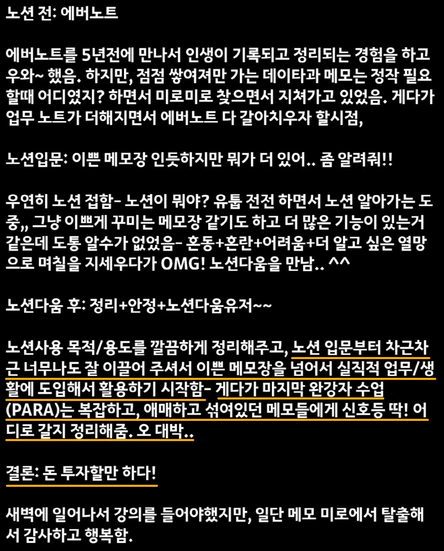 저는 지금 고민의 해답을 찾았고, 노션을 노션답게 사용하는 방법을 알고 있습니다.
