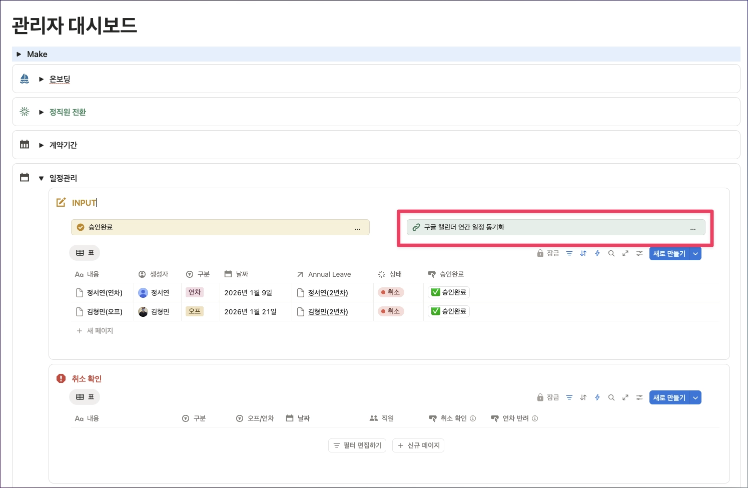 관리자 대시보드 → 일정관리 → 구글 캘린더 연간 일정 동기화 버튼을 클릭하면 동기화 됩니다.