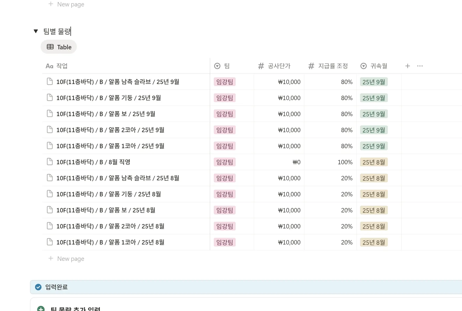 팀 물량에 귀속월 속성을 추가하는 게 아니라, 해당 작업 물량을 2개로 나눠야 합니다.