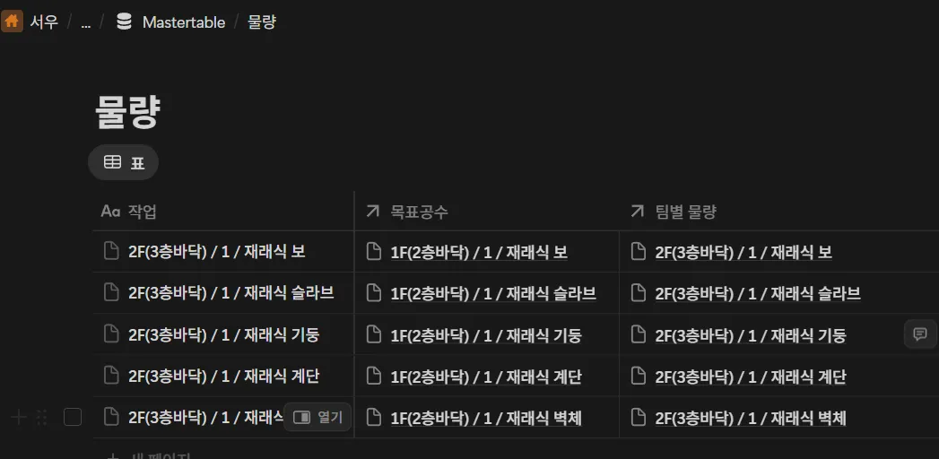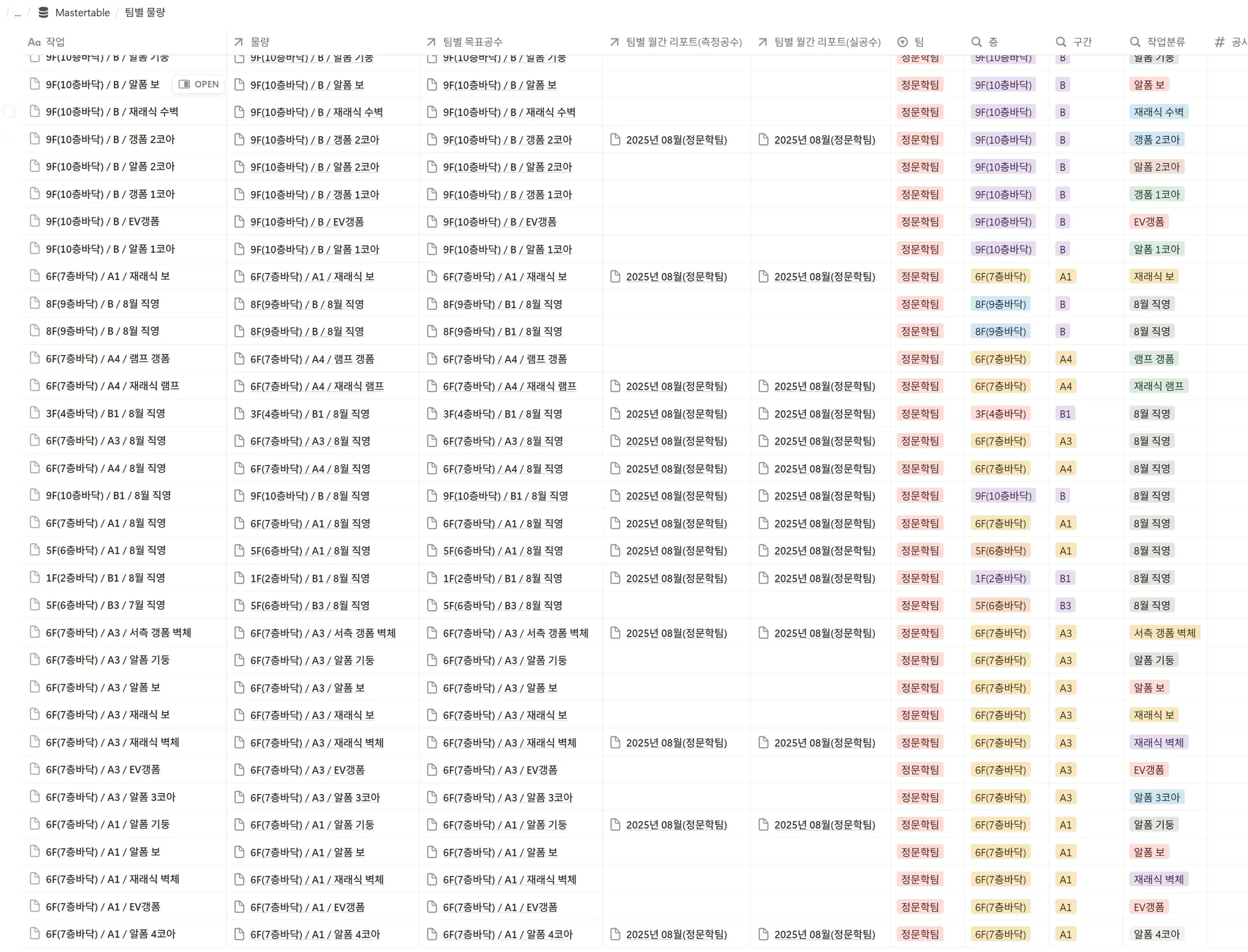 mastertable 물량 부분에서 표와 목표공수와 팀별 물량의 타이틀이 서로 일치하지 않는 오류가 있습니다.