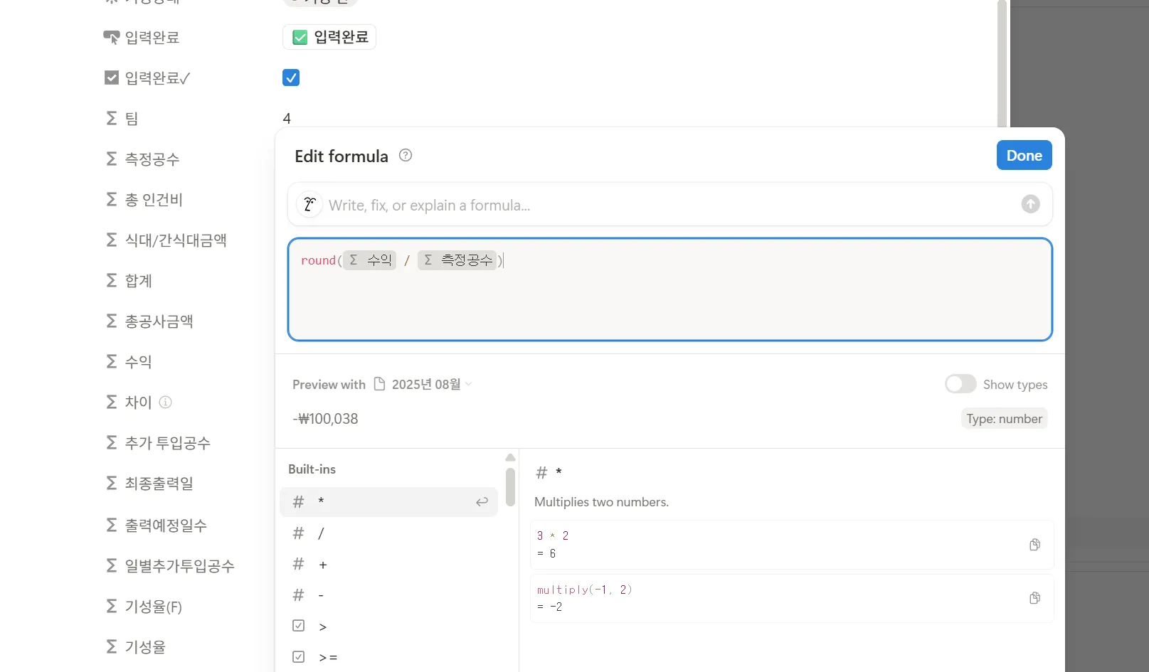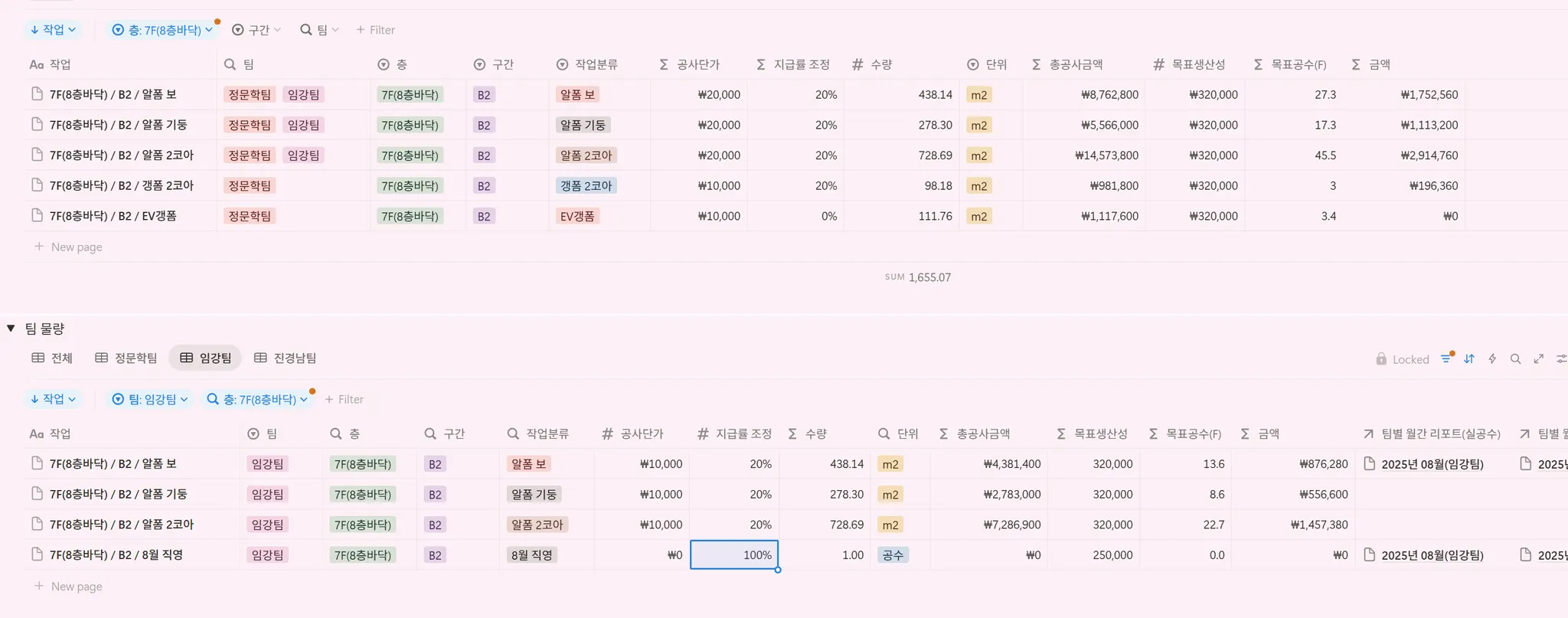 팀별 월간 리포트(실공수), 팀별 월간 리포트(측정공수)의 <총공사금액> 필드 수식 수정했습니다.