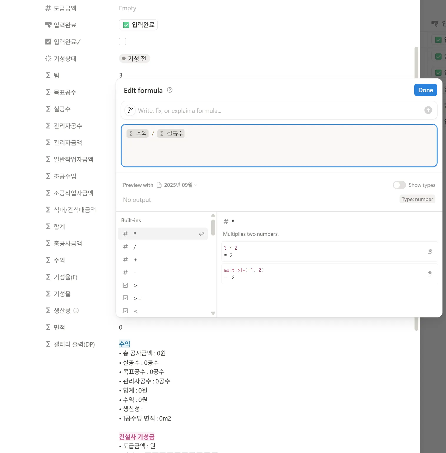 생산성 = 공사금액 / 실공수 입니다. 잘못 개발되었습니다~